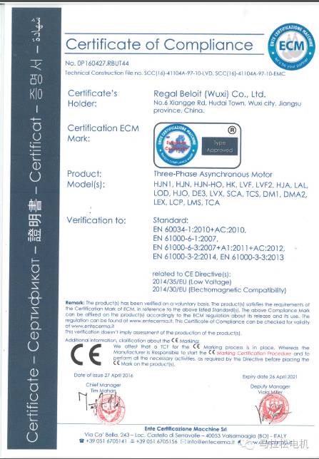 雷勃电气(无锡)有限公司积极响应欧盟委员会的变更公告,经过多方协作,在2016年4月份顺利获得新版CE证书,见附图。新版证书在原版证书的基础上进一步拓宽了认证电机范围,完整覆盖了20个系列产品,同时也包含了EMC和LVD两个指令。